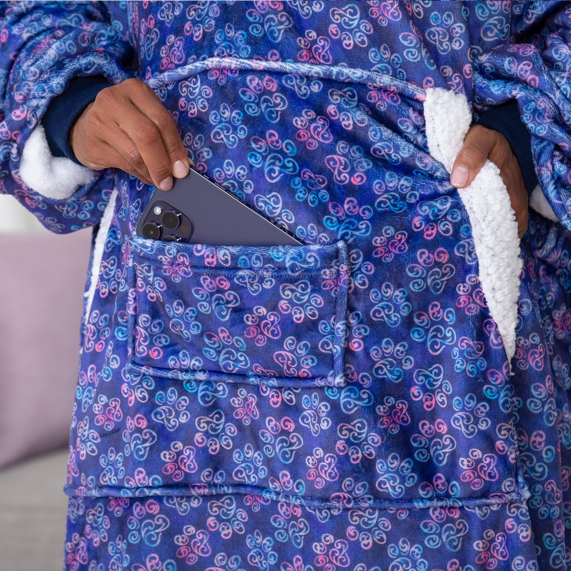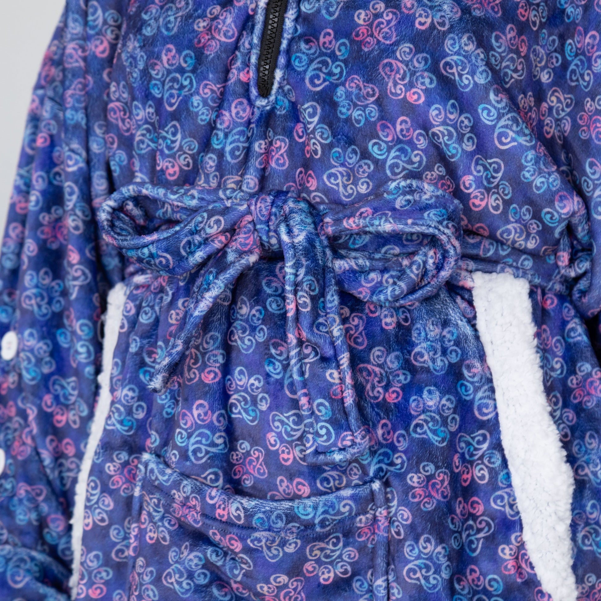 Super cozy™ fleece made into the warmest wearable hoodie blanket! With a comfortable one-size-fits-most style patterned with paw print designs, this wearable fleece blanket is made complete with a cozy hood, 3/4 zipper, pockets -- including a sizable cell phone pocket -- hand covers, and a belt at the waist. Unbelievable softness and lounge-ability!