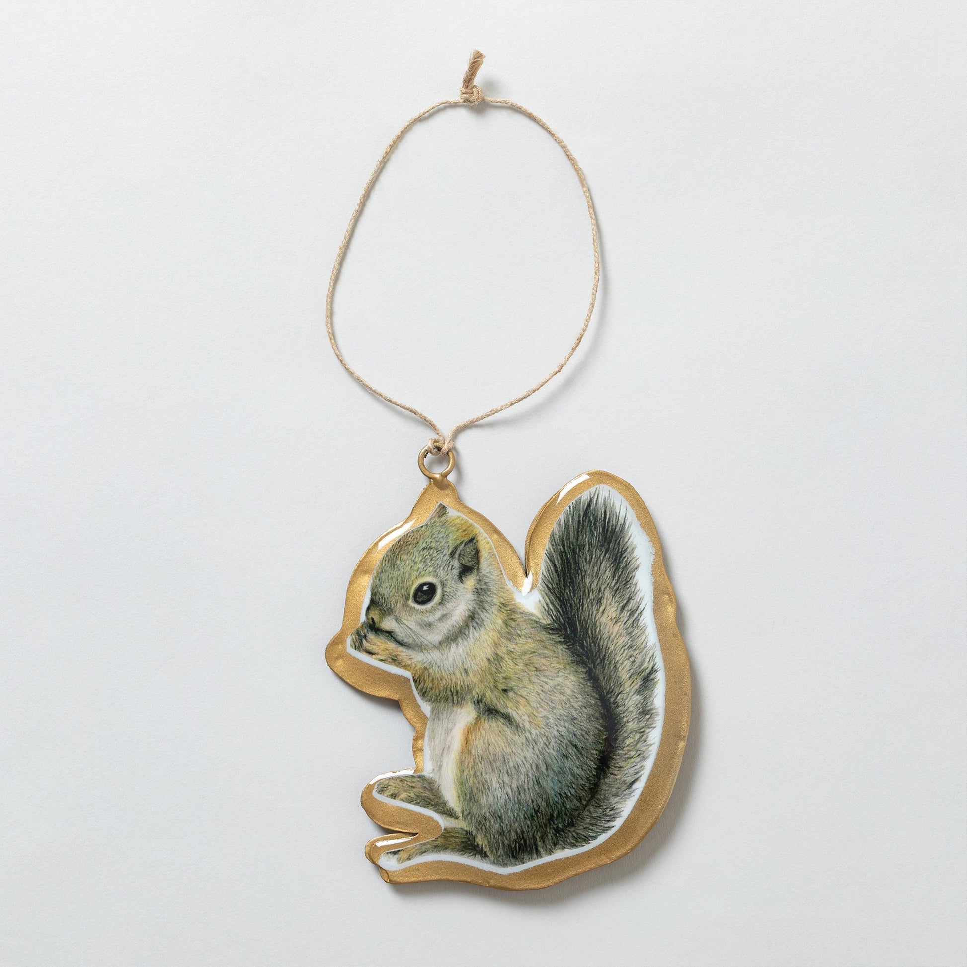 An ornament of appreciation for these bushy tailed critters! Beautifully printed with a clear digital photo of a snacking squirrel, this metal ornament is outlined in gold and strung on a bit of twine for a sweet addition to your Christmas tree.