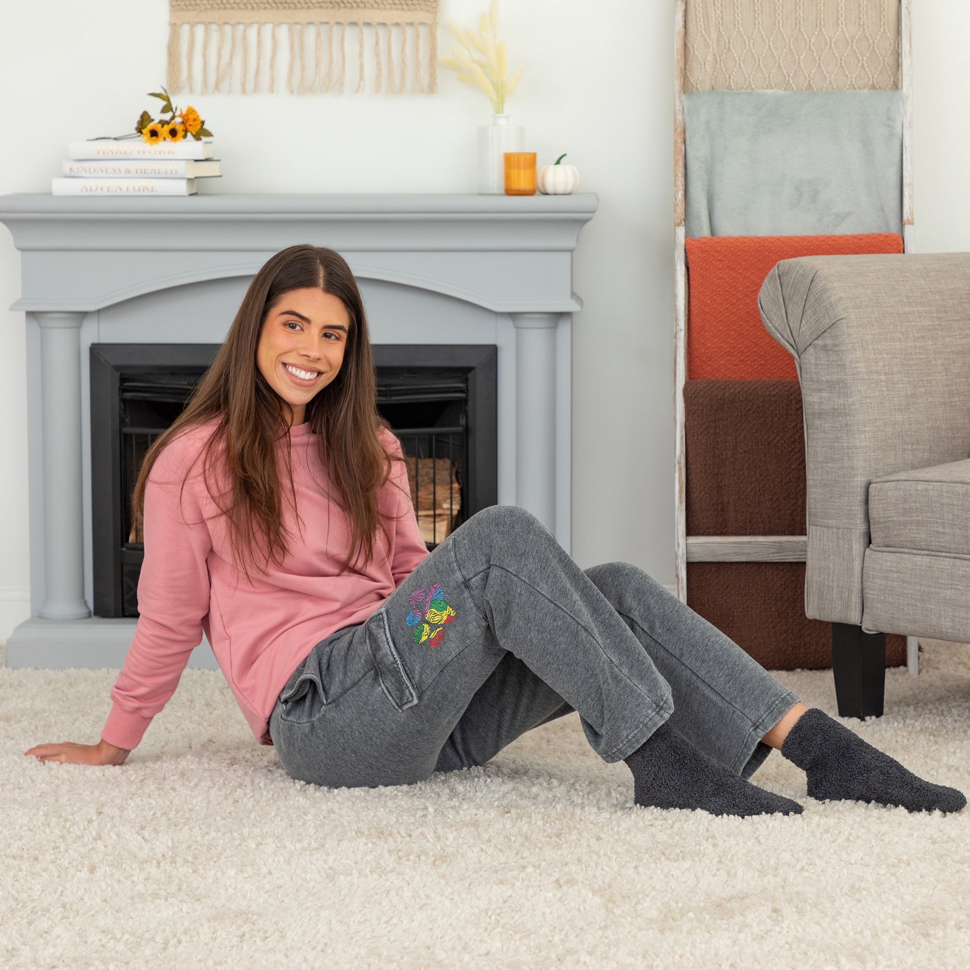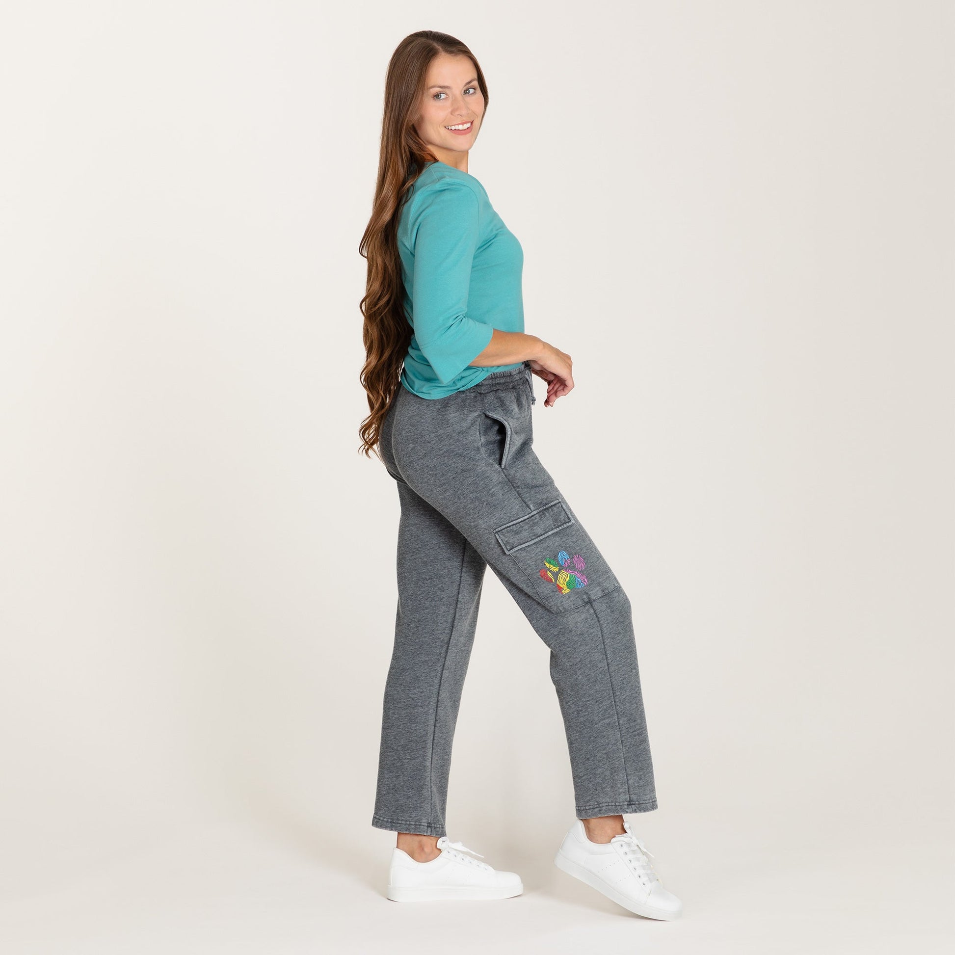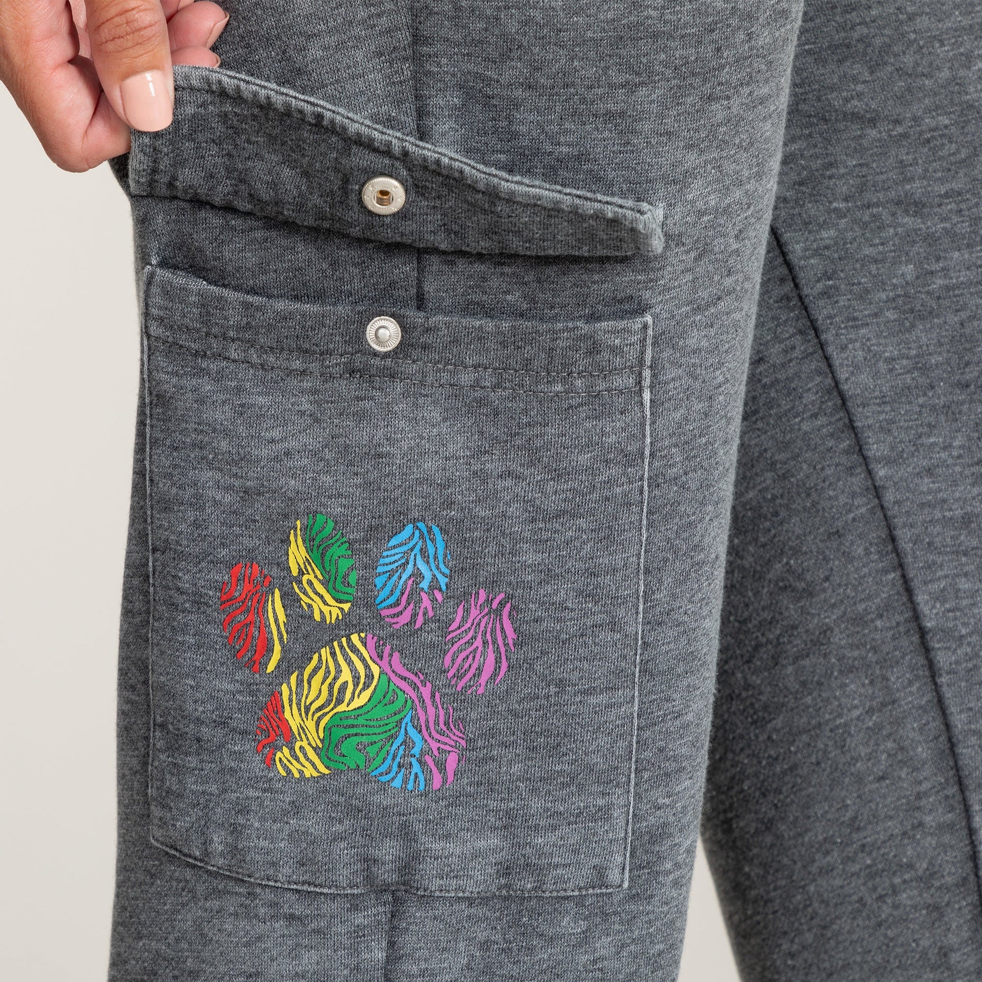 Cute, comfortable, and totally lounge-worthy! Made with a soft cotton blend in a burnout fabric, this lightweight pair flaunts an open leg that isn't constricting at the hems, a comfortable drawstring waist, and pockets. Topped with a rainbow colored zebra print paw on the cargo pocket as a symbol of your animal advocacy!