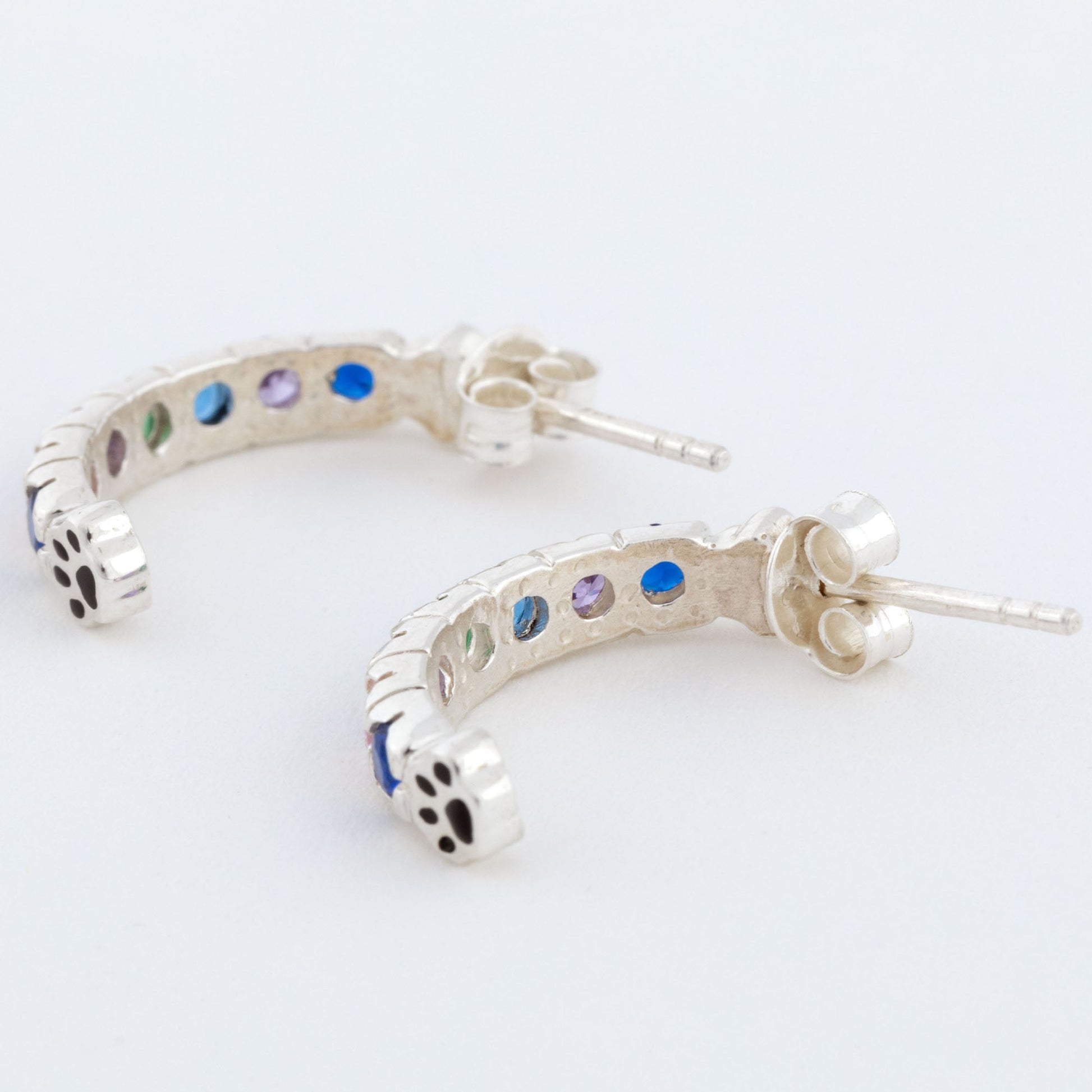Multicolored crystals are embedded in each sterling silver arch earring, symbolizing the rainbow bridge that your furry friend has crossed. Handcrafted by artisans in Bolivia, each earring is topped with a subtle yet heartwarming paw print at the end, keeping your best friend's memory near.
