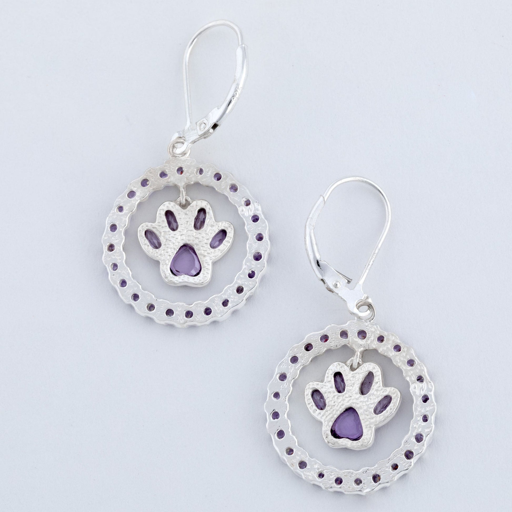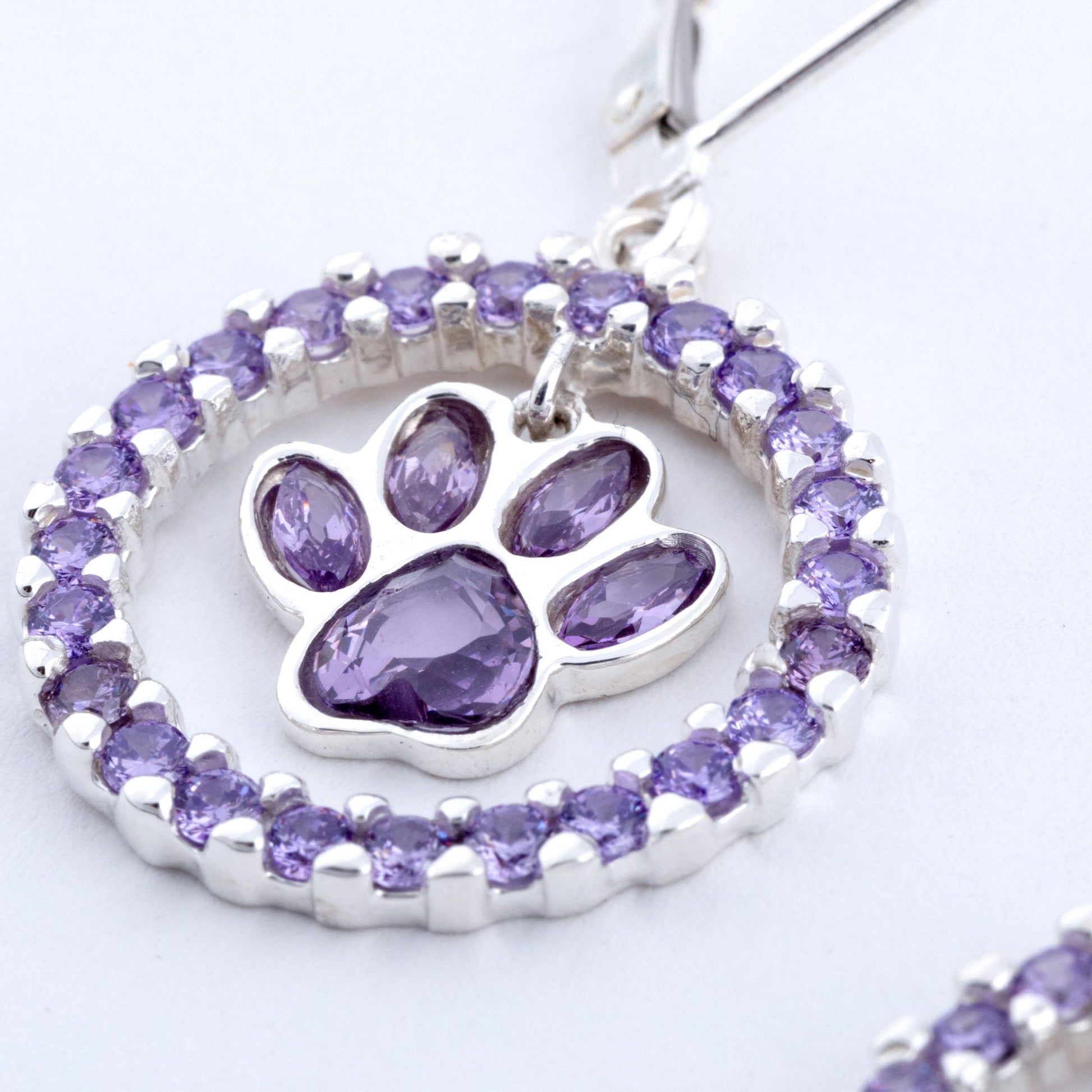 The beauty is in the details and the high quality materials in this sweet pair of dangle earrings! Each earring is hand-crafted by artisans, with a ring of sparkling lavender crystals and a dazzling paw print suspended in the middle.