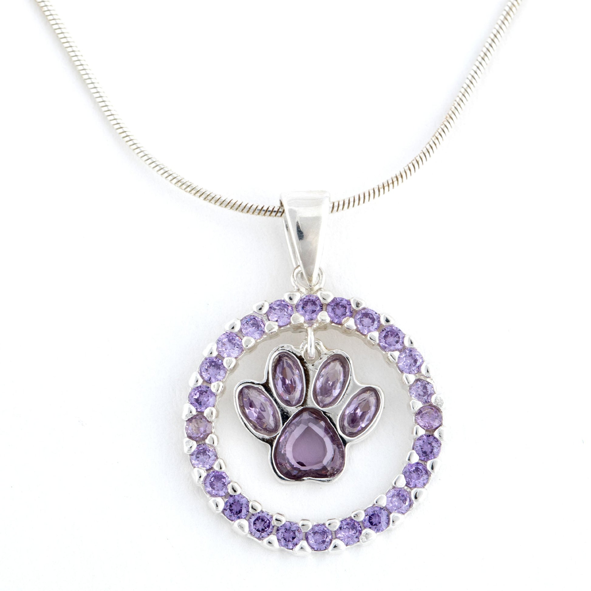 A dazzling ring of purple crystals holds a softly swaying purple paw at the center of this gorgeous accessory. Handcrafted by artisans in Bolivia, this sparkling pendant is crafted with high quality sterling silver that is made to last.