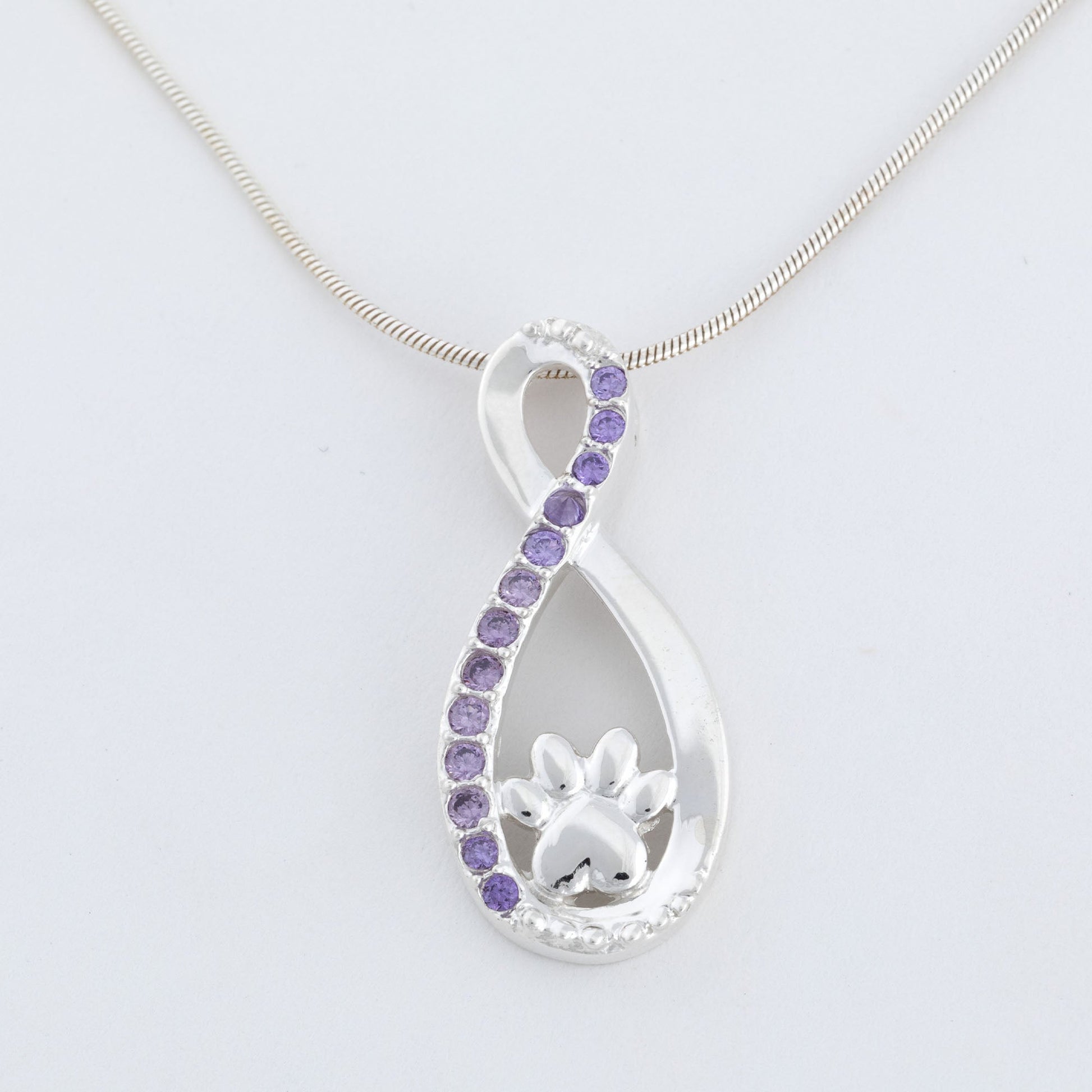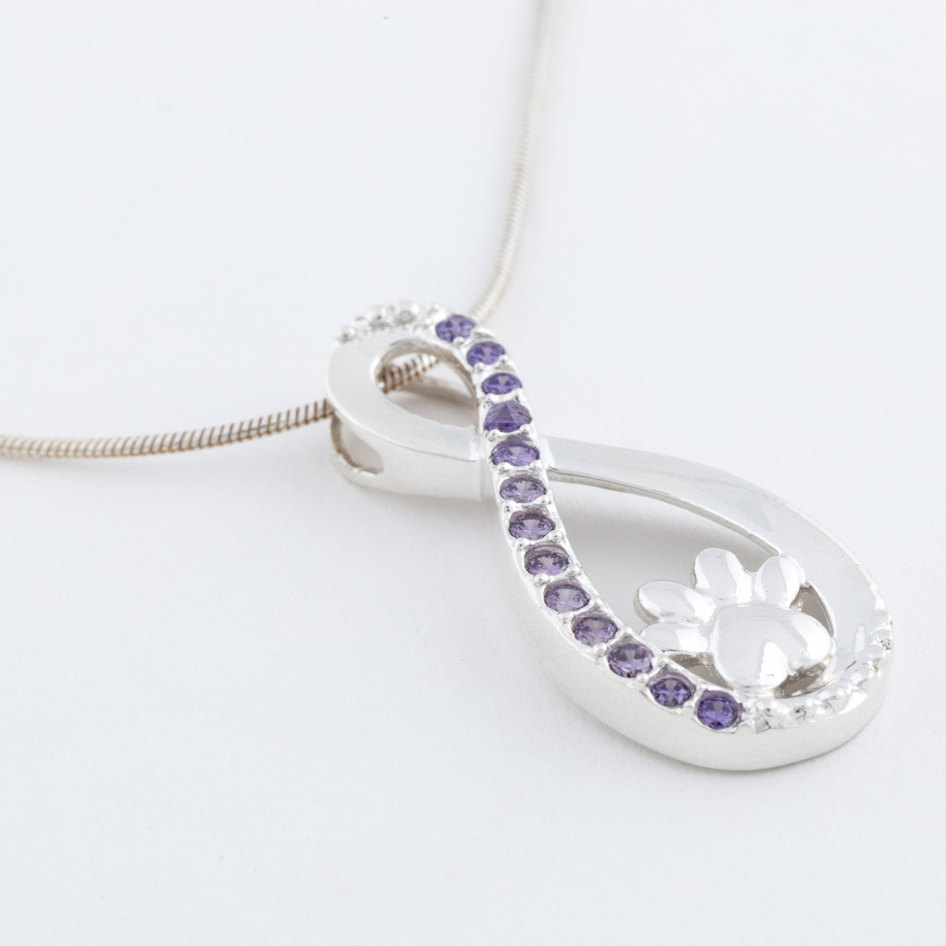 A sterling silver infinity sign is embedded in purple crystals and topped with a silver paw print in this stunning fair trade accessory. Handcrafted by artisans in Bolivia, each pendant sends a heartwarming message of love and support of animal rescue causes.