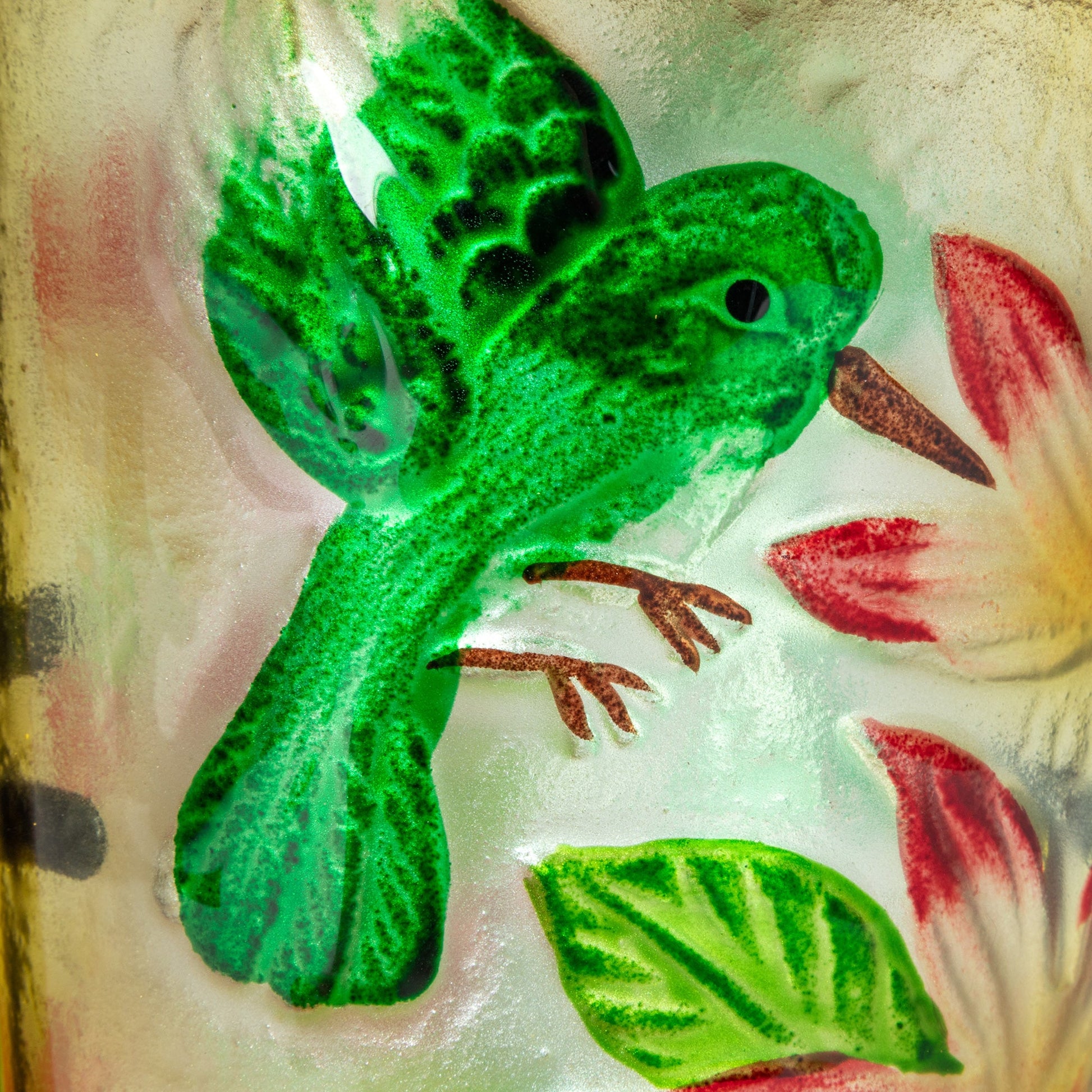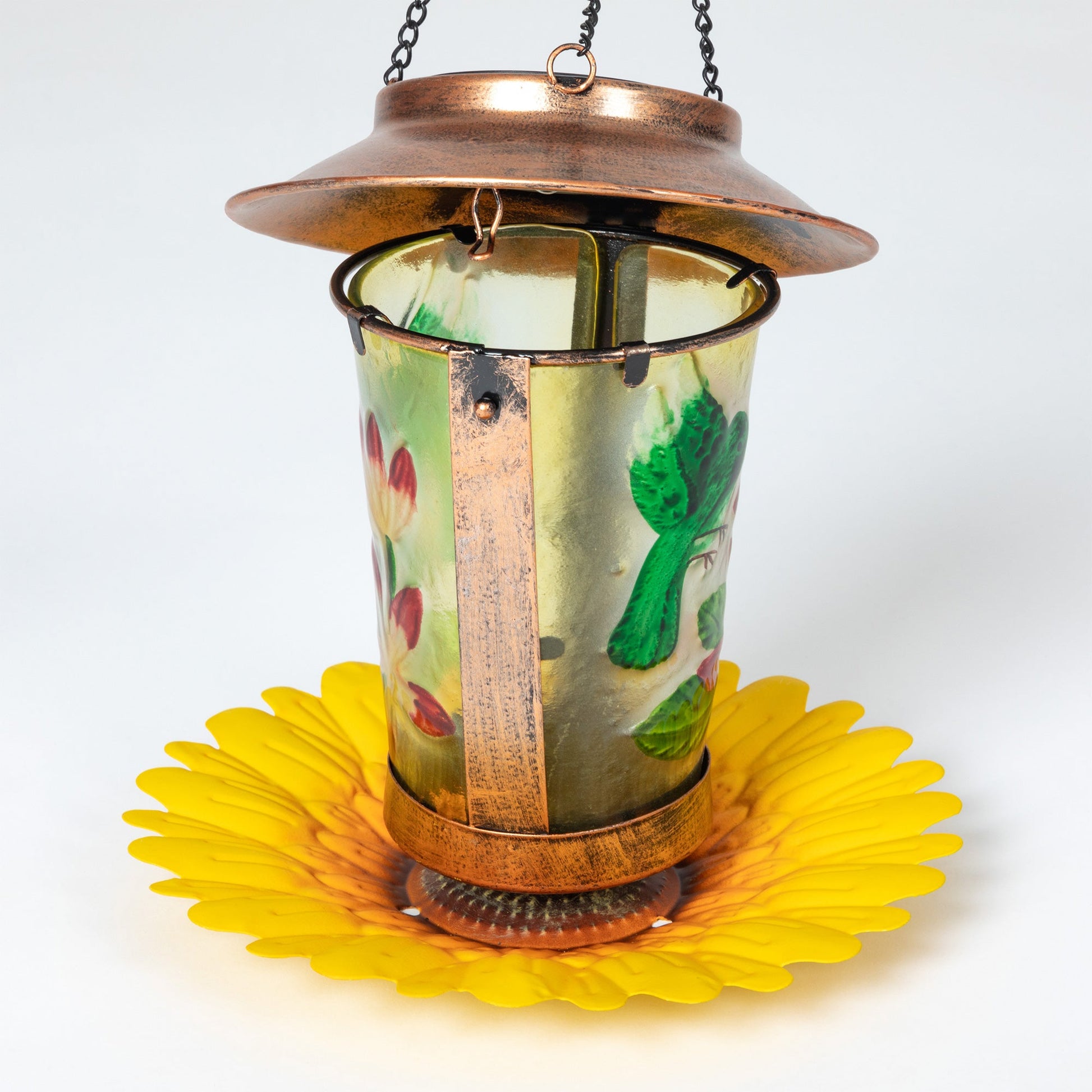 A beautiful painted glass depiction of a hummingbird drinking from flowers makes this bronze accented solar bird feeder a glowing addition to your outdoor space! Containing a rechargeable battery powered with a solar panel, the simple on/off button under the lid is all you need once you've hung this decorative piece with the included hook in a sunny location.