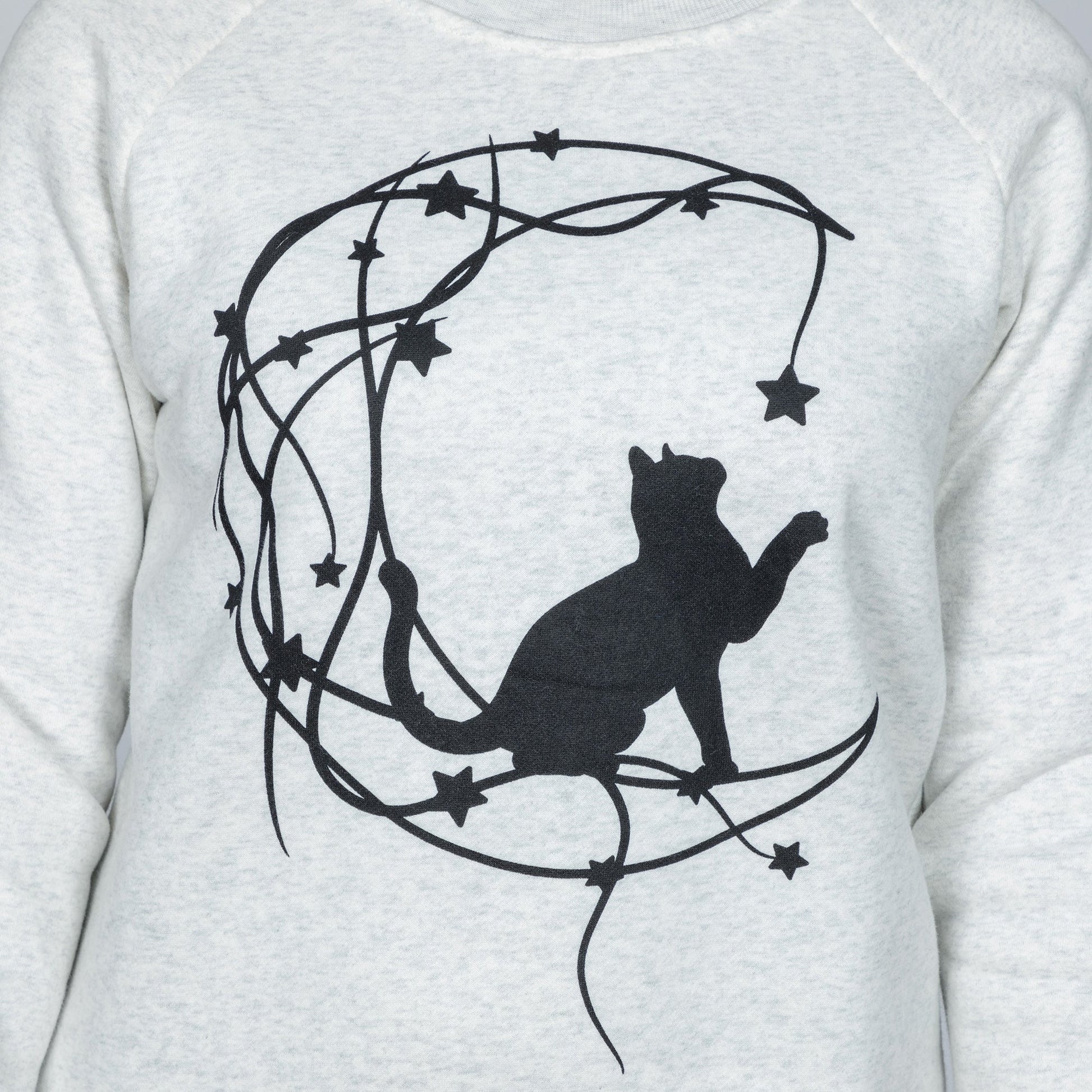 Comfortable and supremely cute, this cat and crescent moon heather gray pullover brings feline-friendly magic to your look! Featuring a cat batting at a star suspended from a crescent moon on a cozy cotton blend crewneck sweatshirt.