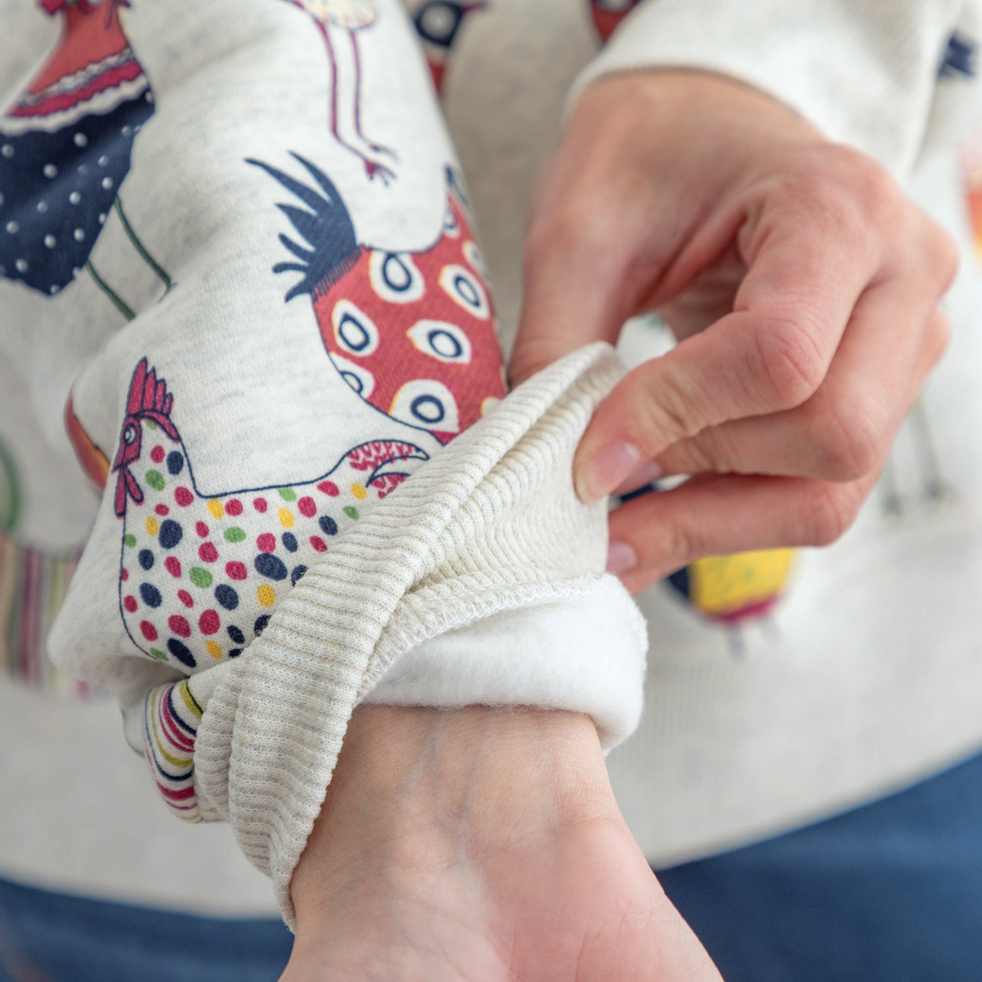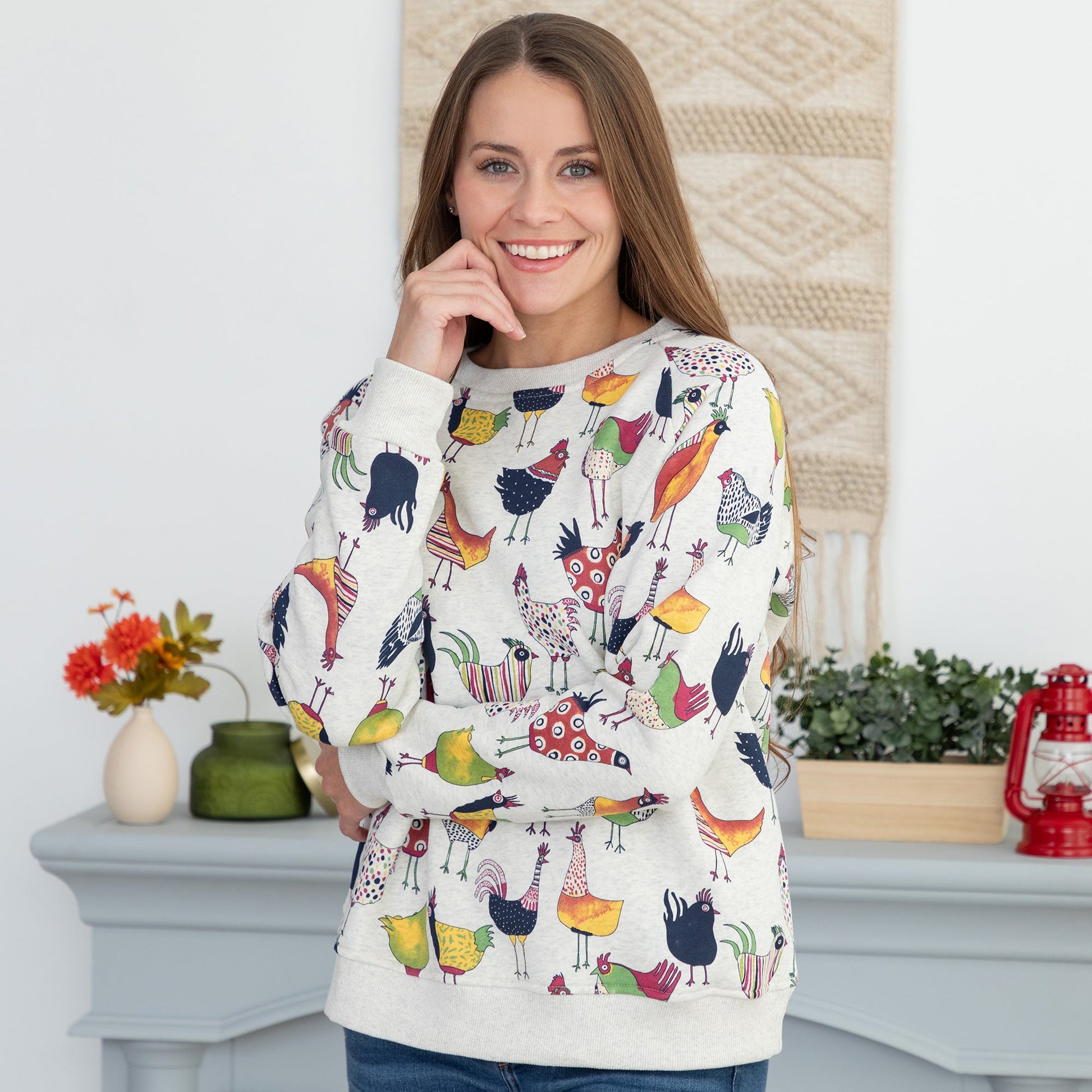 Patterned in cute colorful roosters, this light heather gray crew neck sweatshirt is wildly charming! Made with a cozy cotton-poly blend and finished with added stretch at the wrists and waist for ideal comfort.