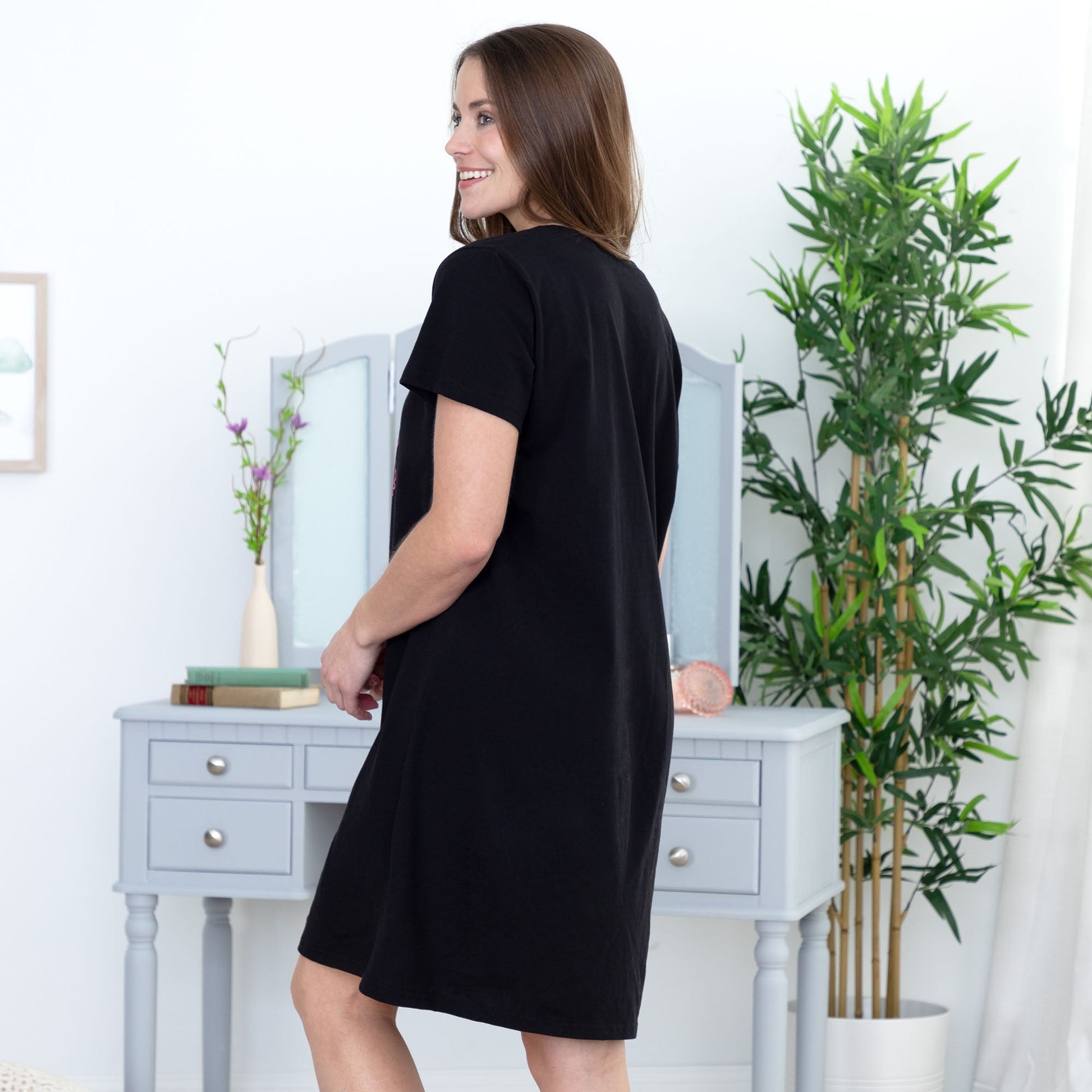 Indulge in cozy comfort and adorable style with this 100% cotton short sleeve nightgown. Crafted in classic black and adorned with vibrant neon silhouettes of your favorite furry friends, whether dogs or cats, this nightgown offers the perfect blend of whimsy and relaxation. Embrace bedtime in style and snuggle up with a charming design that promises a cozy night's sleep.