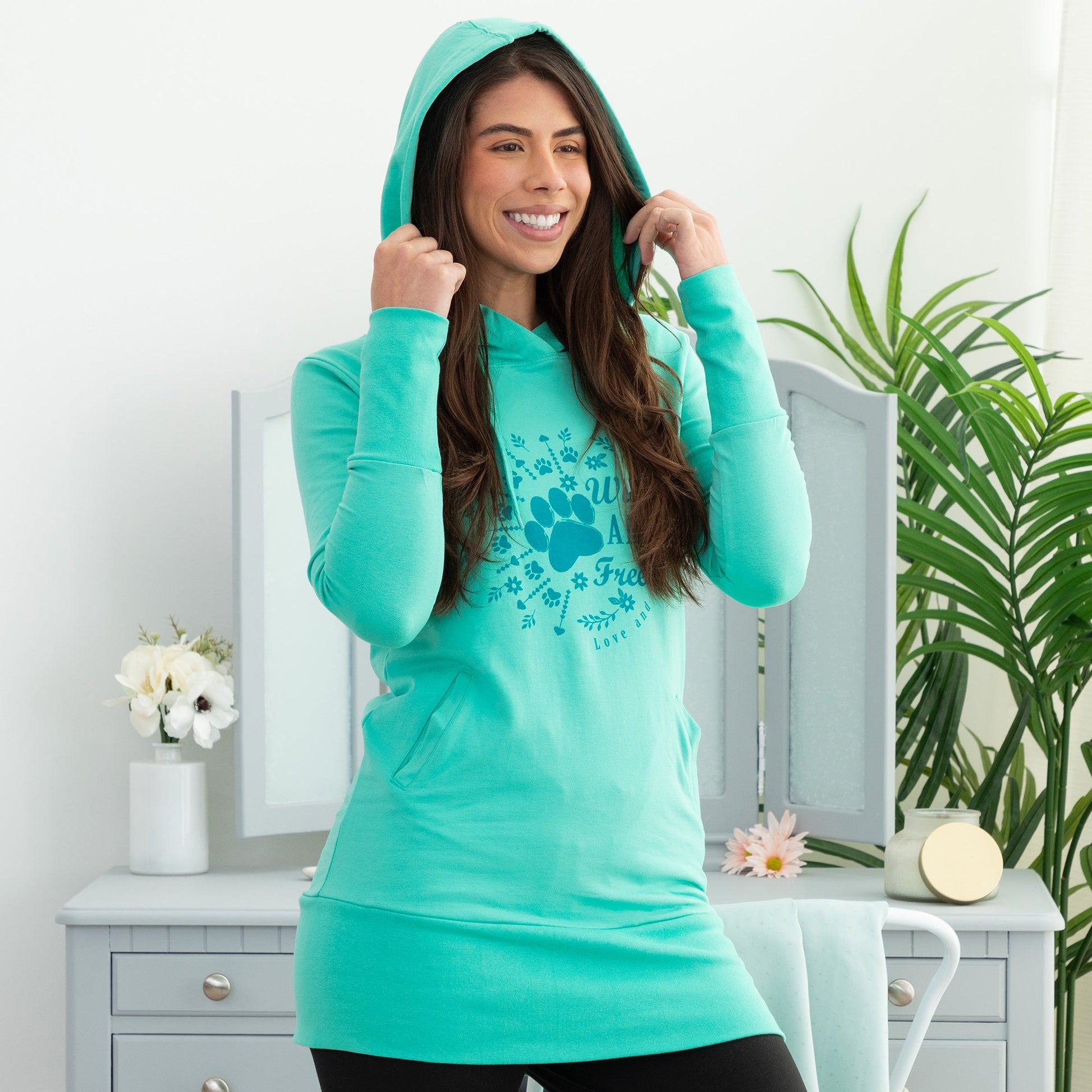This extra long hoodie is made with soft french terry, the epitome of comfort and style. Elevate your casual wardrobe with this versatile and cozy hoodie that seamlessly combines fashion-forward design made with cotton and a touch of spandex for the perfect amount of stretch. Topped with a paw print and the phrase "Wild and Free - Love and Protect."