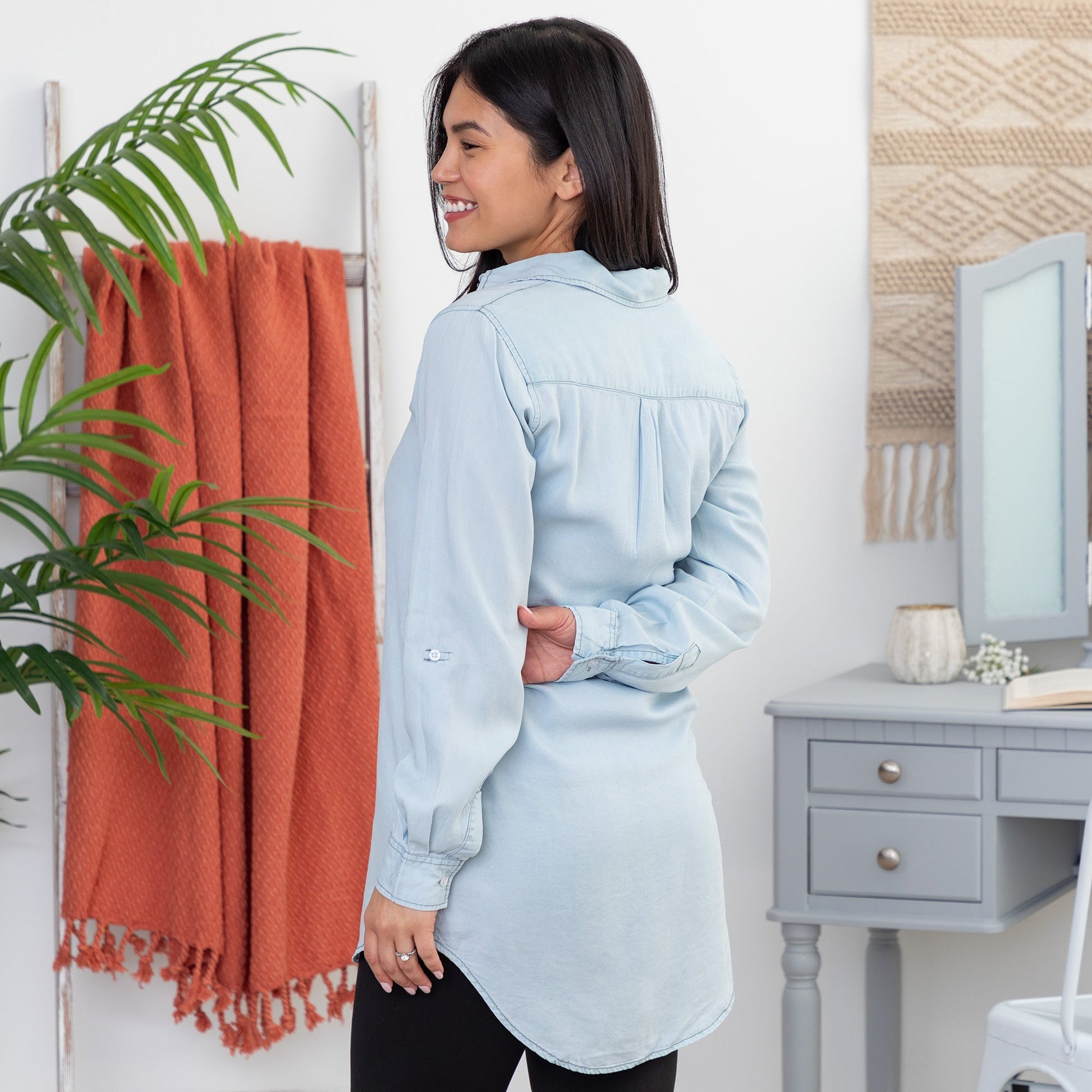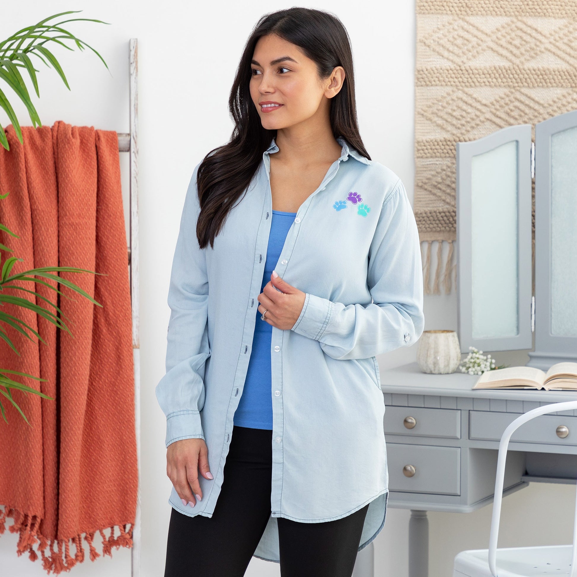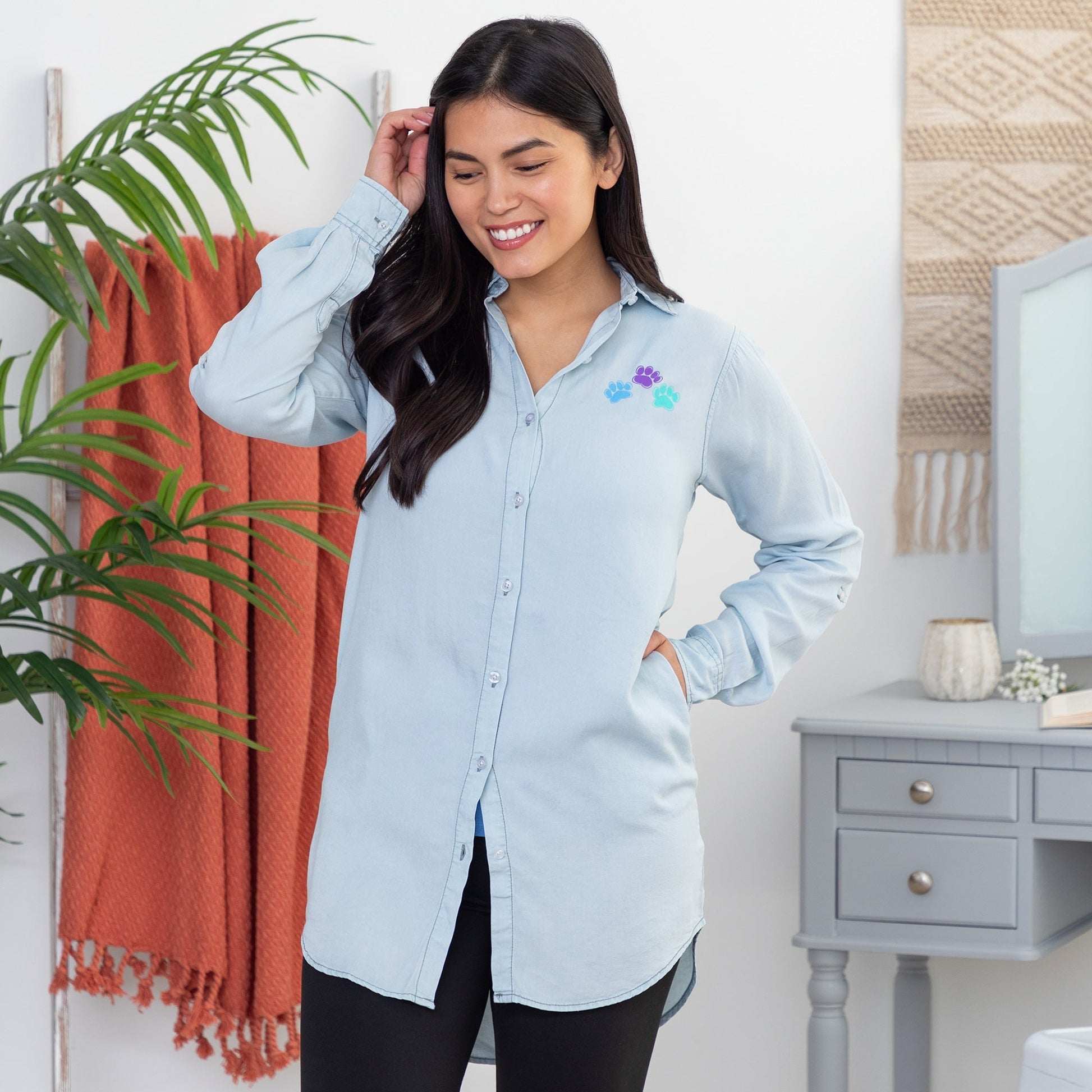 Elevate your casual style with a timeless, button up chambray shirt – the perfect blend of comfort and sophistication. Featuring convenient button tabs for effortlessly rolling up the sleeves, this versatile collared shirt is complete with the two side pockets, and a darling trio of colorful paws on the left chest, proudly displaying your love of animals!