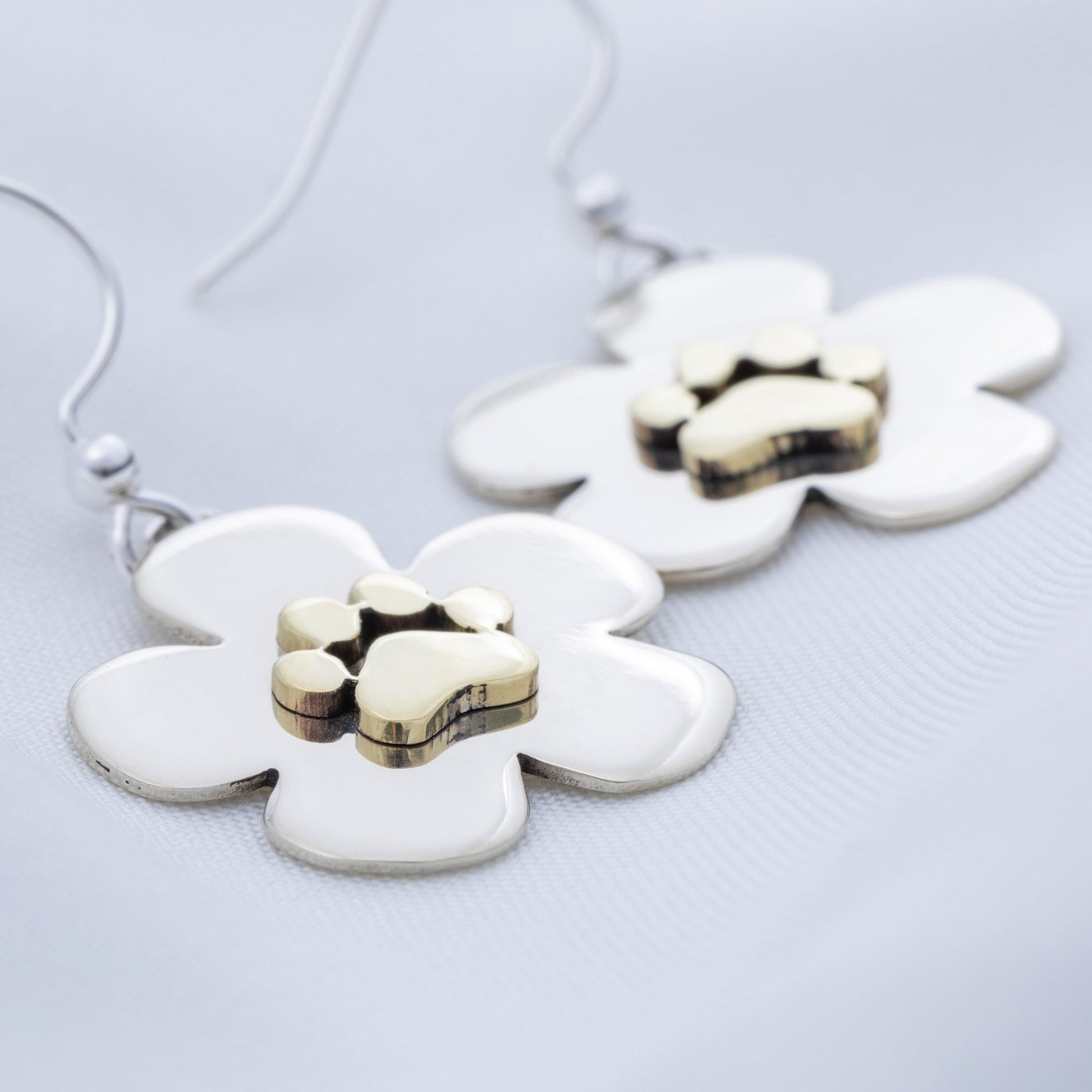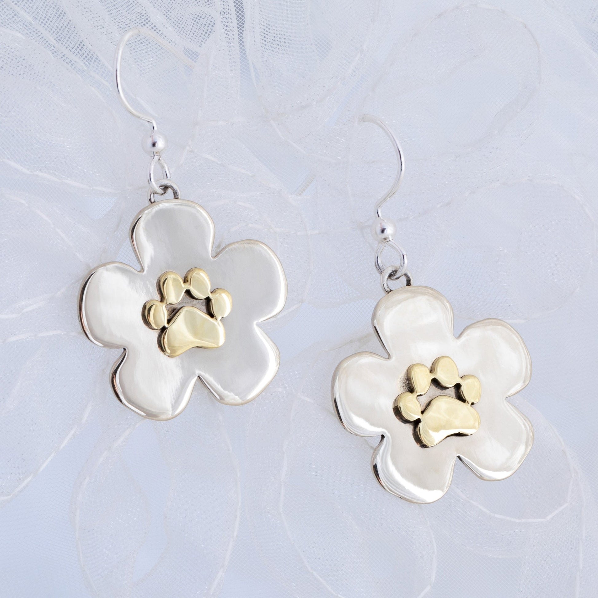 Embrace the beauty of nature with stunning Silver-tone Flower Earrings, delicately crafted to captivate. Each flower is accented with a brass paw print at the center, making these earrings a unique expression of your love for both style and animals.