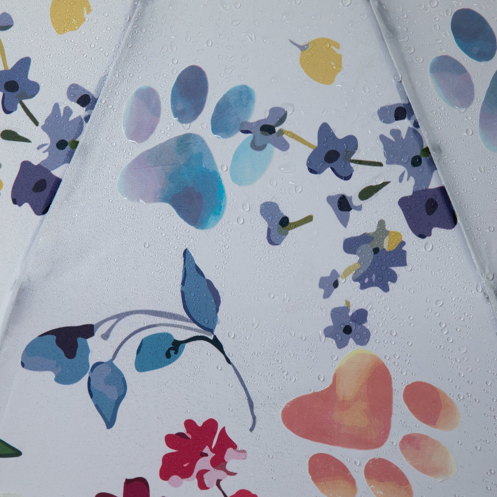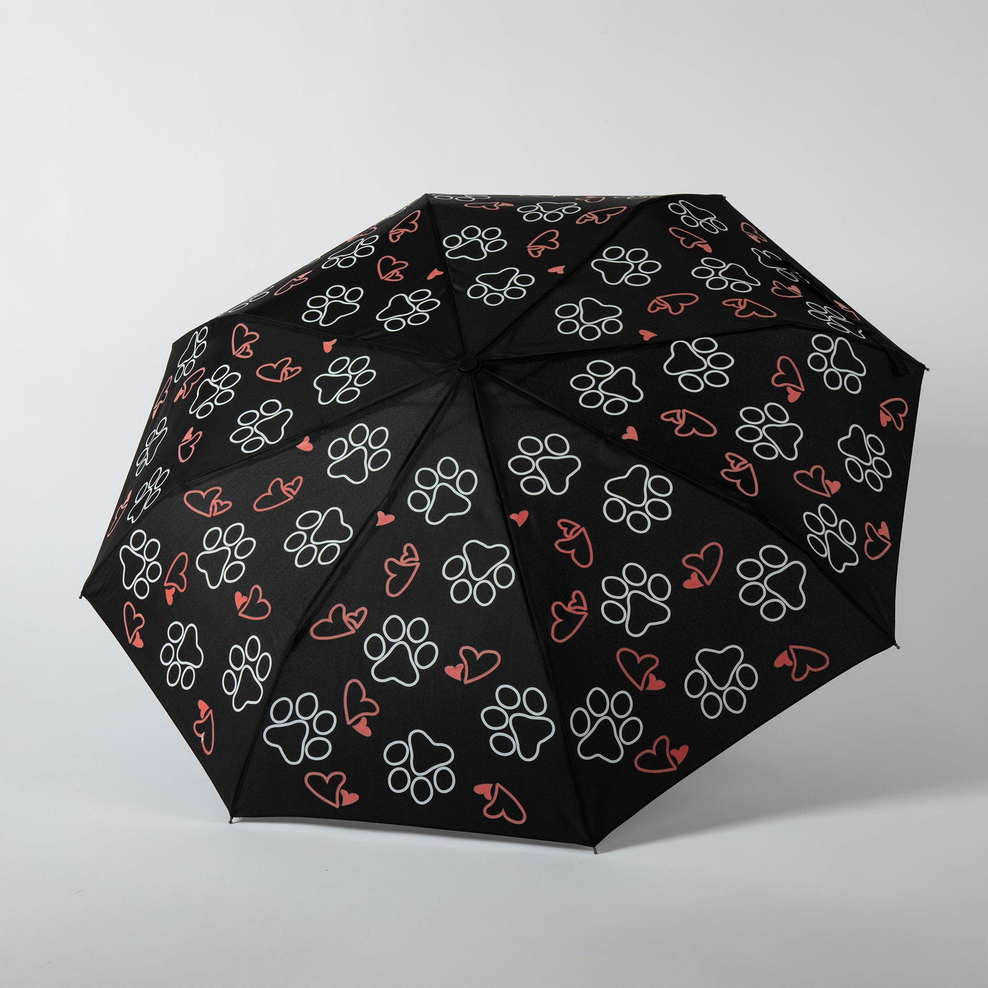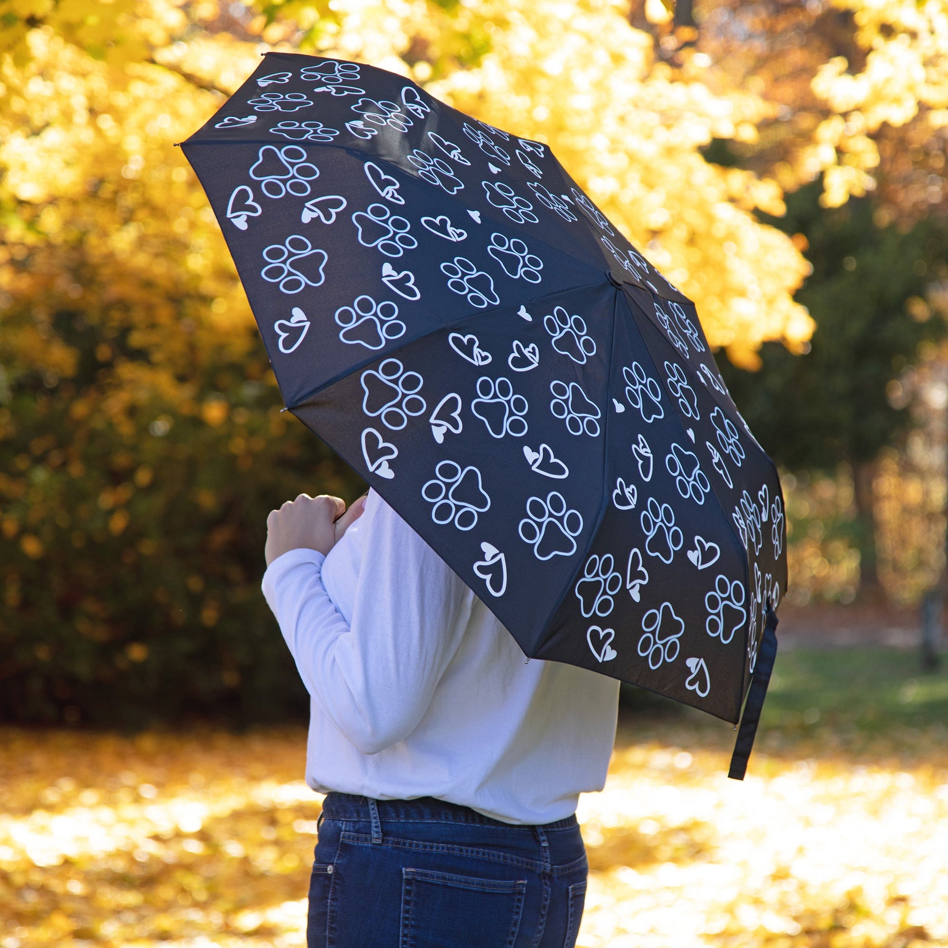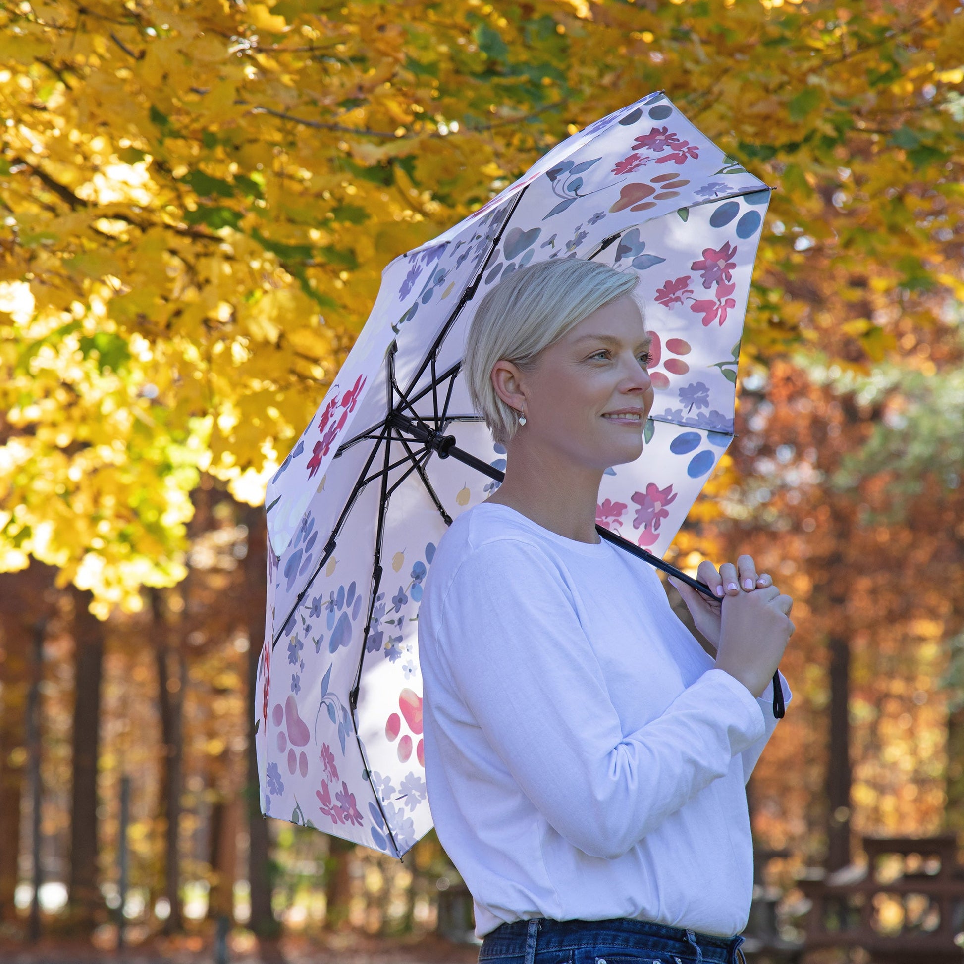 Hearts, paws, and flowers pattern each umbrella like confetti, keeping you dry when the weather has other plans! Made with an automatic open/close button and a comfortable rubberized handle, all of which fits compactly in your bag or car until needed.